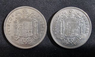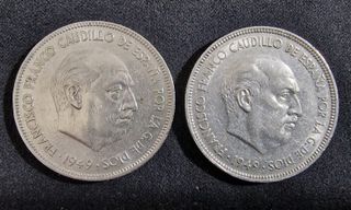 2 Monedas de 5 pesetas de Francisco Franco. Periodo: 1949-1952 AÑO: 1949 *50 PAIS: España MATERIAL: NIQUEL DIAMETRO: 32 mm GROSOR: 2,1 mm PESO: 15 gr. ANVERSO: Cabeza de Francisco Franco mirando hacia la derecha. Leyenda: FRANCISCO FRANCO CAUDILLO DE ESPAÑA POR LA G.DE DIOS-1949. REVERSO: Escudo de España con yugo y flechas debajo. Leyenda: CINCO PESETAS-UNA GRANDE LIBRE-PLUS ULTRA-*19-*50. CANTO: Estriado.
