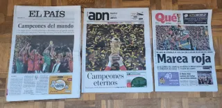 Periódicos españoles celebrando la victoria de España en el Mundial de Sudáfrica 2010. - El País: Campeones del mundo (12 julio) - ADN: Campeones eternos (12 julio) - Qué: Marea roja (13 julio). Regalo otro ADN (13 julio) Precio por todos