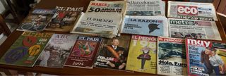 Colección de periódicos y revistas de diferentes épocas, incluyendo El País, El Mundo, Marca, La Razón, ABC, El Periódico, Muy Interesante y Eco. - Títulos variados como Gracias Españoles, Guía de la Buena Vida 1994, Don Juan de Borbón, Hola, Euro y 50 Años de Deporte. - Algunos ejemplares muestran noticias de actualidad de su momento, como EEUU y la OTAN acuerdan dar respuesta al 'acto de guerra' terrorista y Cuatro muertos en un nuevo atentado suicida en Israel. - Ideal para coleccionistas o interesados en la historia reciente, precio orientativo según compras.
