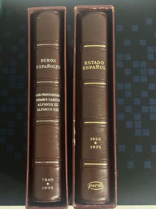 Conjunto de dos libros sobre Duos Españoles y Estado Español. - Duos Españoles cubre los periodos de GOB.PROVISIONAL, AMADEO SABOYA, ALFONSO XII y ALFONSO XIII, con fechas de 1869 y 1899. - Estado Español abarca los años 1936 y 1975, con el sello pardo. El primer albun solo albun. El segundo que abarca los 1936 al 1975 faltan algunas monedas. Hay tambien monedas antiguas y otras clasificadas y otras por clasificar