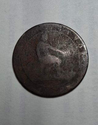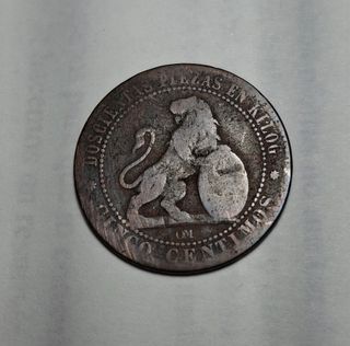 moneda española de 5 céntimos de 1870, acuñada durante el periodo del Gobierno Provisional (1868-1871). Es popularmente conocida en España como una "perra chica". Anverso: Presenta a Hispania sentada con una rama en la mano derecha. Reverso (el lado visible en tu imagen): Muestra un león rampante apoyado sobre un escudo ovalado con las armas de España.En el reverso se lee "DOSCIENTAS PIEZAS EN KILOG" (indicando que 200 de estas monedas pesaban un kilo) y la denominación "CINCO CÉNTIMOS". También aparecen las siglas OM, que corresponden a la ceca de Barcelona (Oeschger Mesdach & Co.).