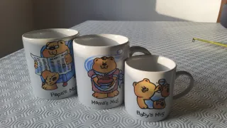 Conjunto de tres tazas con diseño de osos, ideal para toda la familia. - Taza Papa's Mug con diseño de oso leyendo el periódico. Tiene un cachito roto. - Taza Mama's Mug con diseño de osa horneando. - Taza Baby's Mug con diseño de osito jugando con un sonajero.