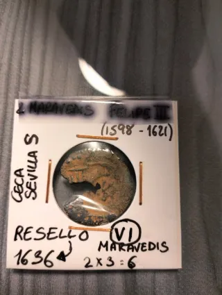 Moneda de 2 maravedís de Felipe III, acuñada en Sevilla en 1636. Presenta un reseño. - Ceca: Sevilla - Año: 1636 - Valor: 2 maravedís - Rey: Felipe III - Periodo: 1598-1621