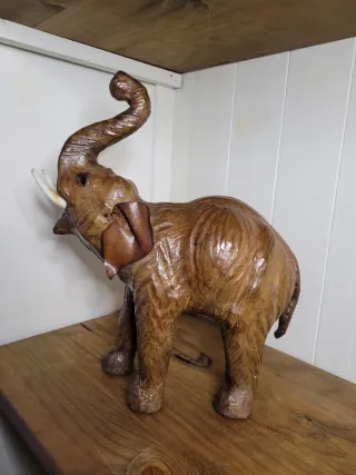 Extraordinaria y rara escultura vintage de elefante en cuero, de alrededor de 1950. Realizada con gran atención al detalle, esta pieza de gran tamaño es a la vez decorativa y llena de carácter. El elefante es de cuero marrón y destaca por su tamaño y su excepcional estado de conservación. El ligero desgaste y la pátina natural del cuero no hacen sino realzar su auténtico atractivo vintage. - Periodo: Circa 1950. Excelente estado vintage con ligero desgaste. Colmillos de plástico y ojos de cristal. -32 cm de alto hasta la punta de la trompa. -27 cm de largo desde los colmillos. Un pieza elegante y rara. VER FOTOS AMPLIADAS
