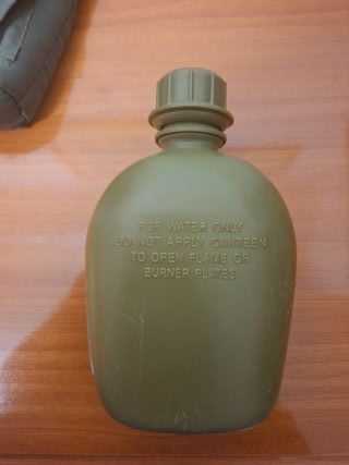 Cantimplora de color verde con funda sin usar. - Fabricada en plástico resistente. - Tapa de rosca segura. - La funda presenta ligeros desperfectos.