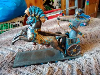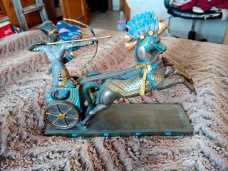 Detallada figura de Ramsés en su carro tirado por caballos. -medidas 27cm de ancho 19 cm de alto - Diseño inspirado en el antiguo Egipto. - Colores vibrantes en azul, dorado y rojo. - color bronce
