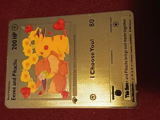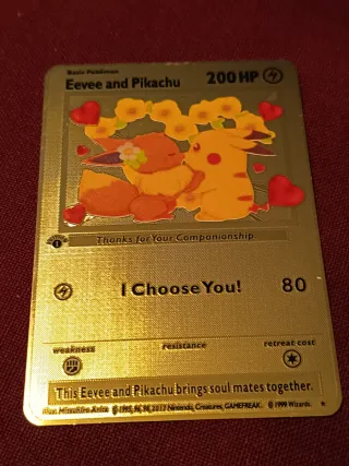 Ponle tú el precio. Rara, rarisima, Metalica Carta coleccionable de Pokémon con un diseño especial de Eevee y Pikachu. Tarjeta de Pokémon Pikachu y Eevee de metal dorado, hecha a medida, regalo de beso de amor, regalo romántico para recién enamorados - Diseño dorado. - Ilustración de Eevee y Pikachu. - Texto: Thanks for Your Companionship. - Texto: I Choose You! - Frase: This Eevee and Pikachu brings soul mates together.
