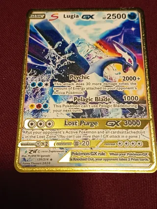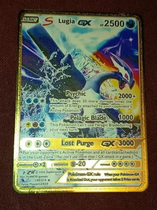 Carta Pokémon de Lugia GX con 2500 HP. - Tipo: Psíquico - Ataque 1: Ataque (2000+) - Ataque 2: Hoja Pelágica (1000) - Ataque GX: Purga Perdida GX (3000) - Debilidad: x2 - Resistencia: -20 - Coste de retirada: 4 - Ilustrador: PLANETA Igarashi - Número de carta: 159/214 ★ - Año: 2020 Carta metálica dorada...nueva. Haz tú oferta...Esta muy solicitada