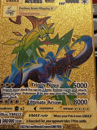Carta Pokémon de Arceus VMAX Gigantamax. Dorada metálica nueva, sin usar. Haz tú oferta. - Habilidad: Trinity Nova - Ataque: Ultimate Arrow - HP: 10000 - Debilidad: x2 - Resistencia: -30 - Retirada: 4 - Ilustrador: YWGS - Número de carta: 999/999