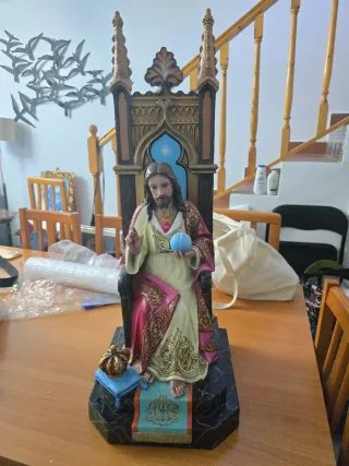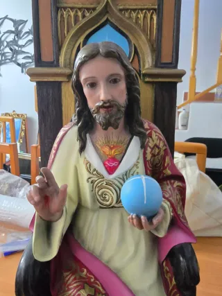 Figura religiosa del Sagrado Corazón de Jesús sentado en un trono, con un pedestal. - Detallada talla con vestimenta ornamentada. - Incluye una corona dorada sobre un cojín azul. - El Sagrado Corazón sostiene un orbe azul. - Base de pedestal con diseño de mármol negro y detalles dorados. Tiene un toque en el cojin que se aprecia en la foto