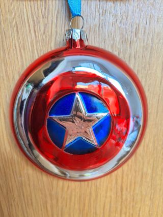 ⚠️ AGOTADO EN SHOP DISNEY⚠️ Este adorno de cristal lanza un guiño al patriótico primer Vengador de Marvel, que sin duda destacará en el hogar de cualquier fan. •Producto inspirado en el Capitán América de Marvel. •Adorno de cristal moldeado con la forma del escudo del Capitán América. •Colores rojo, blanco y azul con un emblema de estrella en el centro. •Acabado brillante y diseño llamativo. •Cinta azul para colgar el adorno. •Producto creado para Disney Store. •12 × 2,5 cm (diámetro × profundo) aprox. •Producto fabricado en cristal y metal. •Limpiar con un trapo.