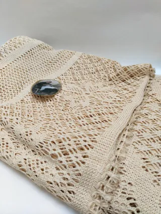 Colcha individual de diseño intrincado, tejida a mano con un delicado patrón. - Acabado con un borde festoneado. - Patrón de rombos calados.