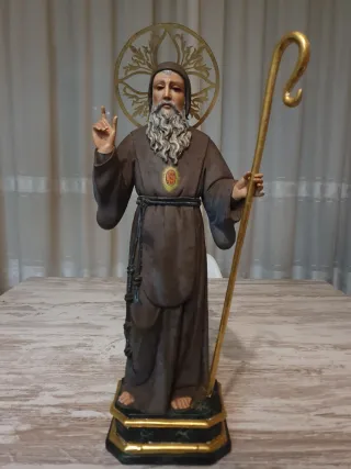 Antigua talla de madera policromada de San Francisco de Paula. Escuela valenciana Ojos de cristal. Altura total 45 centímetros.