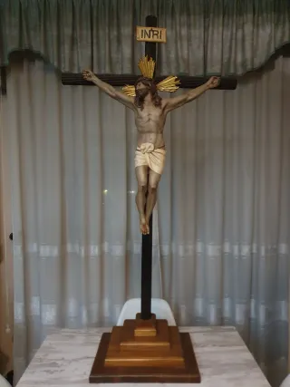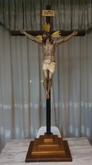 Cristo crucificado realizado en el taller de Olo. Elaborado en pasta de madera policromada y ojos de cristal. - Altura de la cruz con la base 137 x 70 centímetros. - Medidas de Cristo de cabeza a pies 60 centímetros, y de mano a mano 55 centímetros.