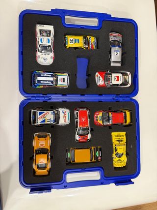 Lote completo de 11 coches Scalextric Tecnitoys escala 1:32. Modelos de rally y turismos (Toyota, Citroën, Peugeot, etc.). Incluye maletín rígido con espuma. Todos guardados y cuidados. No se vende por separado.