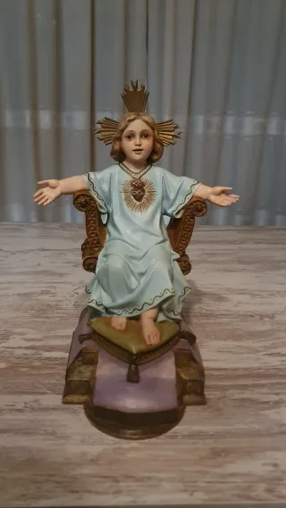 Antiguo niño Jesús Sentado, realizado en el taller extinto de las artes religiosas de Olot. Elaborado en pasta de madera policromada y ojos de cristal. Altura total hasta la aureola 45 centímetros. _____________________________ No Leer Virgen santo Santa cristo religioso escultura olot talla sagrado corazón niño Jesús imagen religiosa Antigua talla