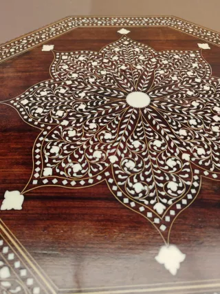 Elegante mesa octogonal hecha a mano con un intrincado diseño de incru MesaDeMadera #MesaArtesanal #MesaOctagonal #MesaTallada #MesaConMarqueteria #MuebleArtesanal #DecoracionHogar #DecoracionInterior #EstiloOriental #MuebleUnico #HechoAMano
