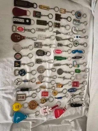 Lote de 60 llaveros coleccionables de los años 80. Una gran variedad de diseños y marcas. - Llaveros de metal, plástico y cuero. - Incluye llaveros de marcas como Jeep, Fagor y Juver. - Diseños variados: botellas, matrículas, escudos y más.