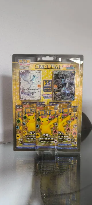 BLISTER 25th anniversary Pokémon TCG. ✅ !! Totalmente ORIGINAL Y SELLADO Blister sellado en Chino de Pokémon 25 Aniversario. +Cada blister contiene 5 sobres y 2 cartas promocionales. 🥳 25th Anniversary Collection: Magikarp & Gyarados Blister 💎 Los 3 Blisters están aún disponibles: Mew & Mewtwo 90€ Magikarp & Gyarados 110€ Zekrom & Reshiram 130€