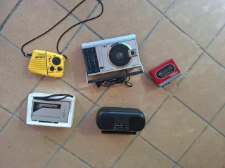 Conjunto de aparatos de audio vintage. - Radio portátil amarilla con correa. - Radio y reproductor de cassette gris. - Reproductor de cassette rojo. - Radio plateada con dial.