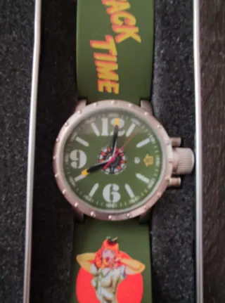 Reloj estilo vintage con ilustración pin-up y texto “Snack Time”. Correa verde de silicona con diseño ilustrado y esfera verde a juego. Incluye caja metálica original con espuma interior. Ideal para amantes del estilo retro, militar o coleccionistas. Estado: Sin estrenar, tiene incluso la pegatina de protección de la caja del reloj. Ha estado siempre en una vitrina. La pila si hay que cambiarla. Envío rápido y bien protegido.