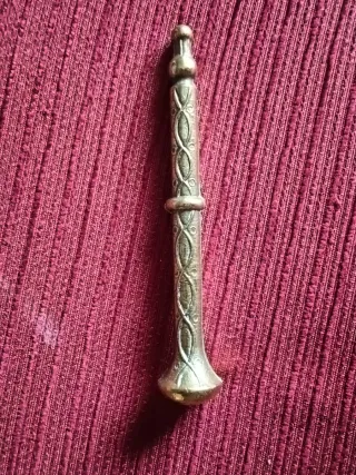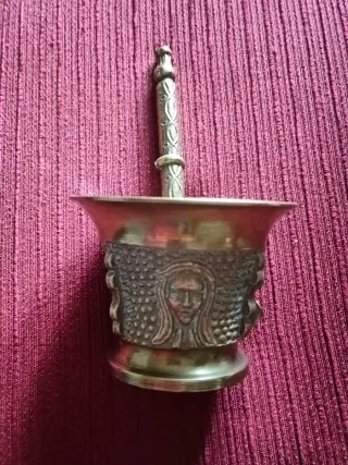 Antiguo almirez de bronce con un diseño decorativo. - alto 6, base 7,5 boca 7 y el mazo 12 cm - Material: Bronce. - Decoración: Rostro humano en relieve y detalles texturizados.