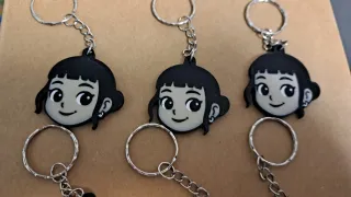 Llaveros con diseño de personaje estilo Kpop. - Diseño de cara con pelo negro y pendientes. - Colgante con cadena metálica.