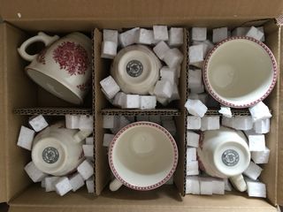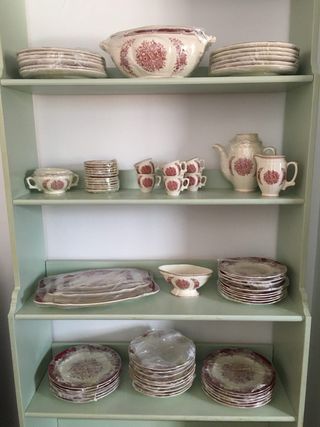 Conjunto de vajilla de la marca Cartuja. Hay una foto con todas las piezas detalladas. - 80 piezas en total. - Diseño clásico con detalles en rojo. - Incluye platos, cuencos, tazas y tetera. Nunca se ha usado muchas piezas sin haber quitado ni el embalaje original.