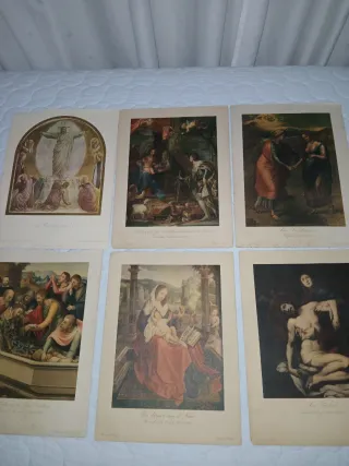 Conjunto de láminas religiosas antiguas con grabados de escenas bíblicas. - Datadas en el año 1943. - Representaciones de la vida de Jesús y la Virgen María. - Impresas en papel de alta calidad.