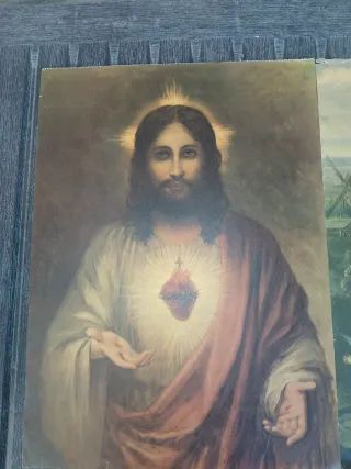 Conjunto de láminas religiosas antiguas con imágenes sacras. - Representación del Sagrado Corazón de Jesús. - Estilo artístico clásico. - Ideal para coleccionistas o devoción.