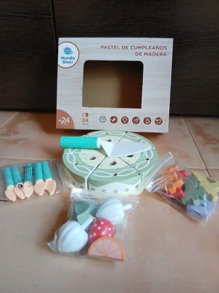 Juego de pastel de cumpleaños de madera. - Incluye pastel, velas, números y accesorios. - Marca: Mundo Diver. - Material: Madera.