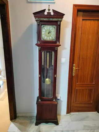 Antiguo reloj de péndulo, una pieza clásica para el hogar. Requiere limpieza de la maquinaria. - Diseño de pie. - Mecanismo de péndulo visible.