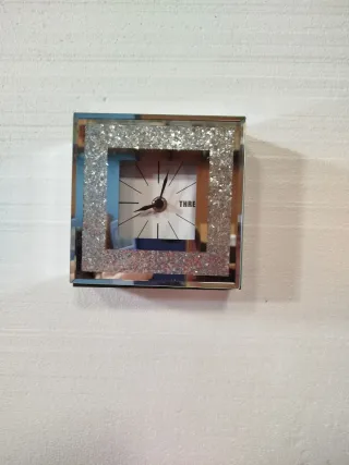 Elegante reloj de sobremesa con un diseño moderno y llamativo. - Marco cuadrado de cristal. - Borde decorado con brillantes plateados. - Esfera blanca con números y manecillas negras.