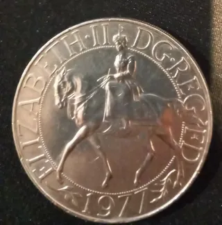 Moneda conmemorativa de Isabel II del año 1971. - Diseño de la reina a caballo. - Inscripción ELIZABETH II D.G. REG. F.D.