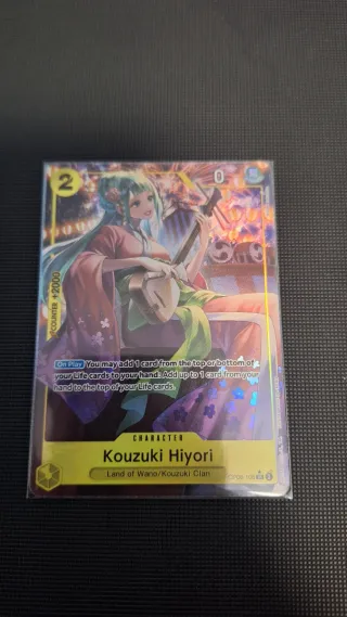 Carta de Kouzuki Hiyori del juego de cartas coleccionables One Piece TCG. - Número de carta: OP06-106 - Tipo: Personaje - Clan: Tierra de Wano/Clan Kouzuki - Coste: 2 - Poder: +2000 - Habilidad: Al Jugar: Puedes añadir 1 carta de la parte superior o inferior de tus cartas de Vida a tu mano. Añade hasta 1 carta de tu mano a la parte superior de tus cartas de Vida.