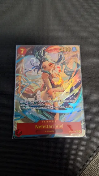 Carta de personaje de One Piece, Nefeltari Vivi. - Colección: OP04 - Número de carta: 118 - Tipo: Personaje - Nombre: Nefeltari Vivi - Afiliación: Alabasta - Coste: 7 - Poder: 4000 - Contra: +1000 - Habilidad: Otorga Rush a tus Personajes rojos con coste 3 o más (excepto a sí misma). - Nota: Esta carta puede atacar en el turno en que se juega.