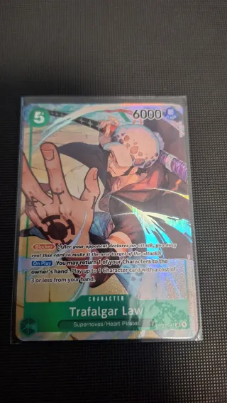 Carta de personaje de Trafalgar Law del juego de cartas coleccionables One Piece. - Personaje: Trafalgar Law - Franquicia: One Piece - Tipo: Personaje - Coste: 5 - Poder: 6000 - Atributos: Supernovas/Heart Pirates - Habilidad: Blocker, On Play - Código: OP01-047