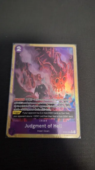 Carta de evento de One Piece, Judgment of Hell. - Tipo: Evento - Coste: 2 - Habilidad: Counter DON!! -1 - Trigger: Si el oponente tiene 6 o más cartas DON!! en su campo, el oponente devuelve 1 carta DON!! de su campo a su mazo DON!!. - Código: OP02-089