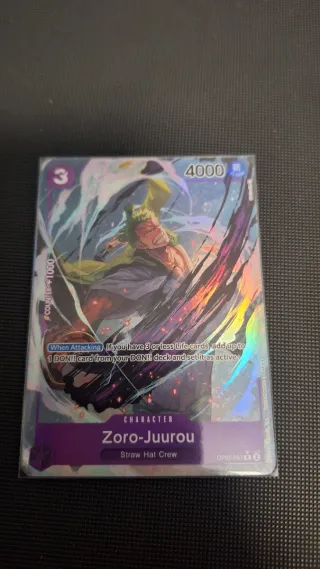 Carta de personaje de One Piece, Zoro-Juurou. - Serie: OP05 - Nombre: Zoro-Juurou - Tipo: Personaje - Clan: Sombrero de Paja - Coste: 3 - Poder: 4000 - Contra: +1000 - Habilidad: Cuando ataca, si tienes 3 o menos cartas de Vida, añade hasta 1 carta de DON!! de tu mazo DON!! y ponla activa.