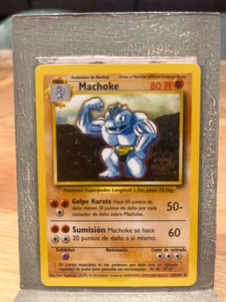 Carta Pokémon de Machoke, edición en español. - Ataque Golpe Karate hace 50 puntos de daño. - Ataque Sumisión hace 20 puntos de daño a sí mismo. - Coste de retirada de 3 energías. - Ilustración de Ken Sugimori.