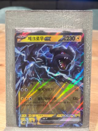 Carta de Pokémon Zekrom EX con 230 puntos de salud. - Ataque Voltic Burst con daño base de 130+. - Ataque Bear Claw con 50 de daño. - Debilidad x2. - Coste de retirada: 2.