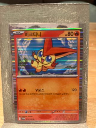 Carta coleccionable de Pokémon, edición en coreano. - Pokémon: Victini - Tipo: Fuego - HP: 80 - Ataque: V-Pose (120 de daño) - Ilustrador: Nausica Yoshida - Número de carta: 012/086 R