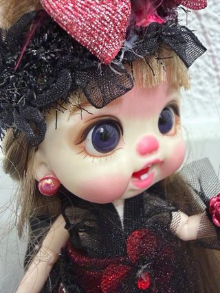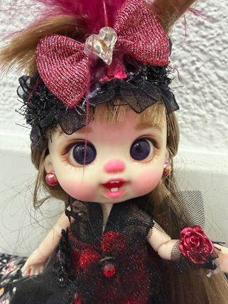Muñeca BJD articulada con un diseño detallado y llamativo. Es preciosa y muy cuqui. Entrega con el conjunto que aparece en las fotos. Es un vestido con detalles brillantes y aplicaciones rojas. Estilo cancán. Accesorios decorativos en la cabeza y muñeca. Con pendientes tipo ópalo. También la tiara de plumas en la cabeza y los zapatos. Es muy bonita, tiene unos ojos grandes y expresivos y está sonrojada. De aspecto infantil. Pelo largo y suave. Lo lleva trenzado parcialmente como se ve en las fotos pero se puede peinar como se quiera.
