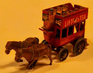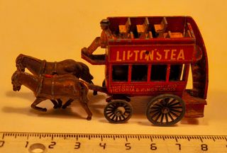 Este es un antiguo autobús de juguete de metal de Lipton's Tea, con dos caballos,camión grua camiòn de bomberos,ingleses - Detalle de LIPTON'S TEA en el lateral. - Inscripción LONDON GENERAL OMNIBUS COMPANY LIMITED VICTORIA & KING'S CROSS en la parte inferior. - Incluye figura de conductor y asientos en la parte superior.