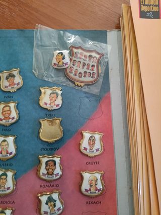 Colección de pins del FC Barcelona, de la época de Banca Catalana. Incluye caricaturas de jugadores. - Pins de jugadores como Romario, Stoichkov, Cruyff, Eusebio, Lopetegui, Ivan, Abelardo, Reixach, Eschaich, Txiki. - Caricaturas de futbolistas icónicos.