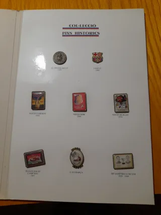 Colección de pins históricos del Fútbol Club Barcelona. - Incluye pins y láminas conmemorativos de los años 1899 y 1994. - Diseño inspirado en el escudo del club y eventos históricos. - Presentado en un formato de libro o carpeta. - En perfecto estado