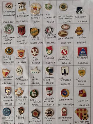Colección de pines con escudos de diversos equipos de fútbol. - Diseños variados y coloridos. - Ideal para coleccionistas.