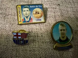 Lote de tres pines del Fútbol Club Barcelona. - Pin con escudo del FC Barcelona. - Pin de Hristo Stoichkov, Balón de Oro 1994. - Pin de López.