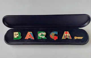 Conjunto de pines antiguos con las letras BARÇA y SPORT. - Diseño de letras con motivos deportivos y de banderas. - Incluye la letra 'B' con un balón de fútbol. - La letra 'A' tiene un diseño inspirado en la bandera de Estados Unidos. - La letra 'R' presenta un diseño de hojas verdes. - La letra 'Ç' tiene un diseño con los colores del club y un corazón. - La letra 'A' final está decorada con la Cruz de San Jorge y la bandera catalana. - Incluye un pin adicional con la palabra SPORT.