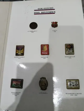 Colección de pins históricos del FC Barcelona. - Incluye pins de diferentes épocas del club. - Diseño conmemorativo del FCB. - Ideal para coleccionistas del fútbol.